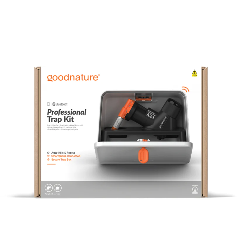 De Goodnature professional set maakt deze set uniek want deze set wordt geleverd met een beveiligde box. Deze box is aan de buitenkant af te sluiten en is kind vriendelijk. De box is ook bedoelt ter bescherming van het apparaat en eventuele andere indringers. De Goodnature® ratten en muizenval doodt automatisch 24 ratten of muizen - de een na de ander, zonder dat u het CO2 patroon tussentijds moet vervangen. Het maakt gebruik van niet-giftige lokstof en doodt ongedierte op een humane manier. De val wordt geleverd met een smart cap, die u laat weten hoeveel dieren er zijn gedood. De val wordt geleverd met een houder die gemakkelijk aan een boomstam of houten paal kan worden bevestigd.