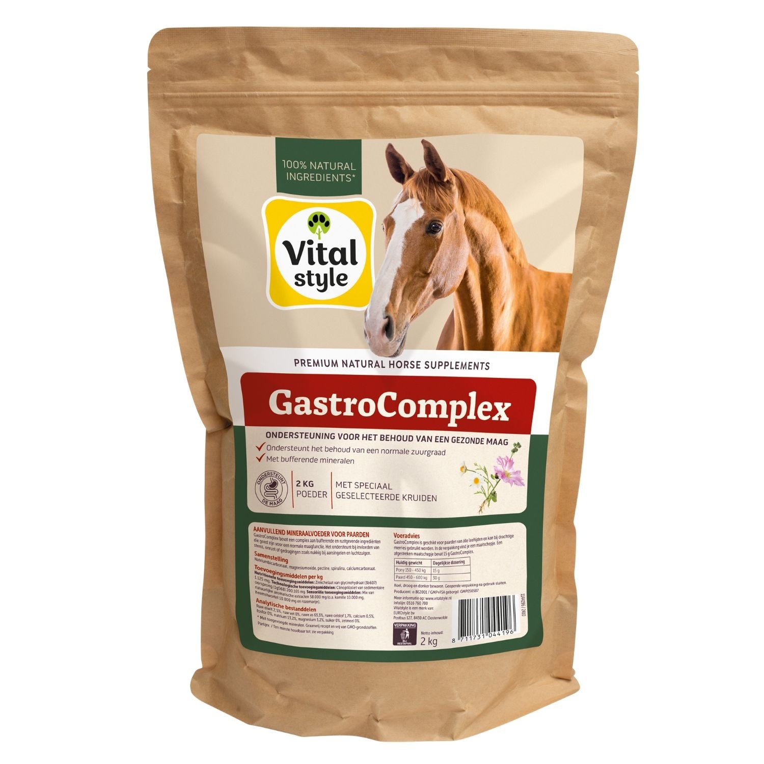 GastroComplex van VITALstyle (voorheen ECOstyle) is speciaal ontwikkeld voor paarden met een gevoelige maag. Het beschermt tegen de invloeden van stress, beschermt de maagwand en bevat buffers voor het behoud van een normale zuurgraad in de maag. Het complex aan rustgevende en bufferende ingrediënten zorgt voor het behoud van een goede zuurgraad in de maag. Ook wordt het maagslijmvlies beschermd en verzacht dankzij de kruidenextracten.