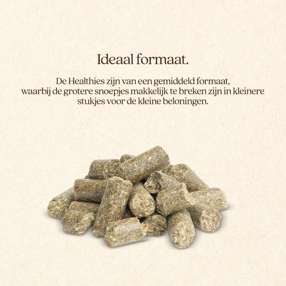 Geef je paard of pony enkele Healthies per dag als beloning naast het dagelijkse rantsoen. De maximale dagelijkse hoeveelheid is 50 gram per 100 kilogram lichaamsgewicht. Bewaar de snoepjes koel, droog en donker.