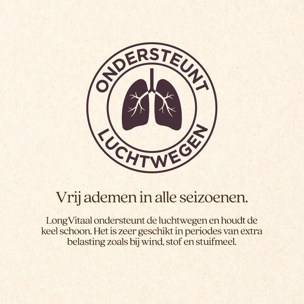 In de brokjes van LongVitaal zitten kruiden verwerkt die ervoor zorgen dat de longen en luchtwegen weer sterker en gezonder worden. De kruiden die hierin verwerkt zitten zijn: fenegriek, brandnetel, zouthoutwortel en anijszaad. Voor de rest bestaat dit product uit tarwegries, moutkiemwortels en gist.