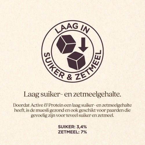 Active & Protein is een vezelrijke en gezonde muesli die als dagelijkse aanvulling op het ruwvoer kan dienen. Deze muesli bevat alle vitaminen en mineralen die een paard nodig heeft en heeft een hoog gehalte aan energie, eiwitten en vetten om optimale prestaties te ondersteunen. Het is speciaal ontwikkeld voor paarden die fanatiek getraind worden of een (tijdelijke) verhoogde behoefte hebben aan energie en eiwitten. Deze muesli bevat een hoog gehalte aan eiwitrijke vezels uit lupinevlokken en luzerne, wat de spijsvertering ondersteunt. Door de combinatie van deze vezels, een hoog gehalte aan lijnzaadolie en prebiotica wordt de energievoorziening verhoogd en wordt het spierweefsel ondersteund bij intensieve inspanning.