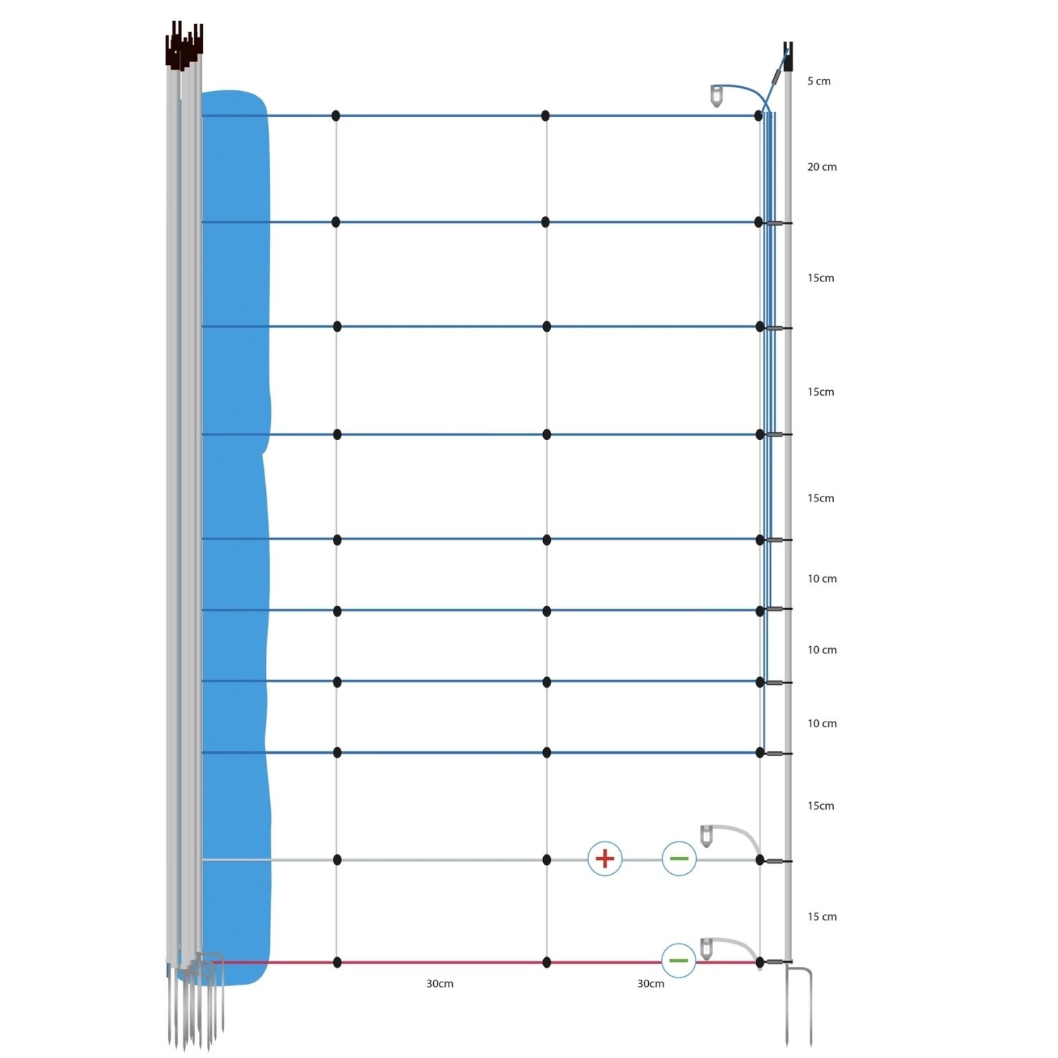 Het opvallend blauwe net met witte palen is duidelijk zichtbaar voor wilde dieren, wat helpt ongelukken te voorkomen. De 10 horizontale draden in combinatie met 6 koperen geleiders van 0,25 mm zorgen voor een uitstekende stroomgeleiding van slechts 0,05 Ohm per meter. Daarnaast zijn 40 roestvrijstalen geleiders over het net verdeeld, waardoor de geleiding 14 keer beter is dan bij een standaard wolvennet. Dit minimaliseert spanningsverlies en houdt het voltage hoog, ook wanneer meerdere netten aan elkaar worden gekoppeld.